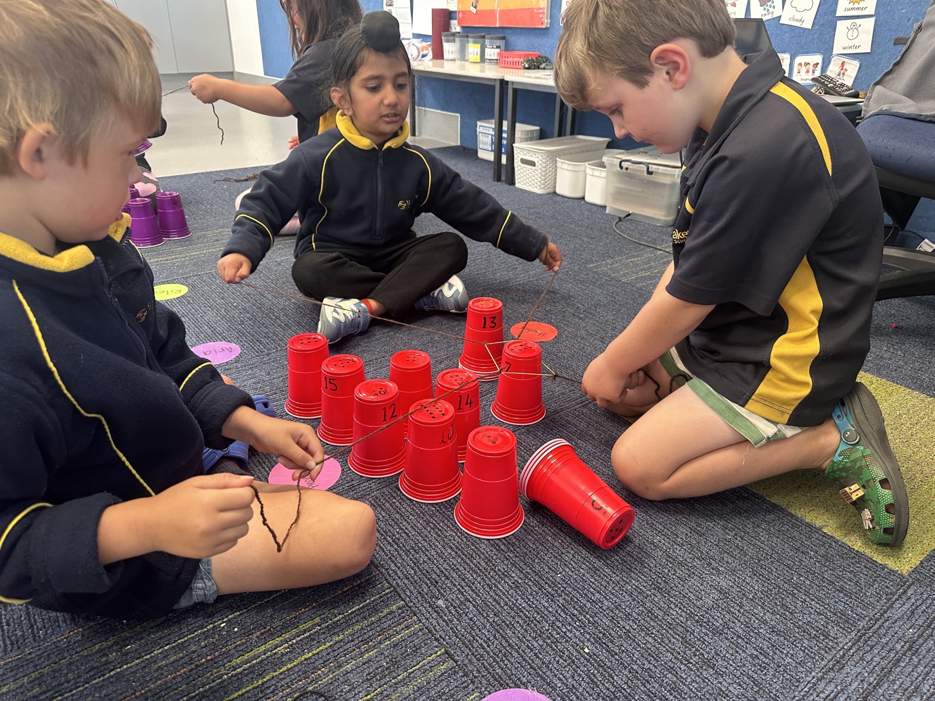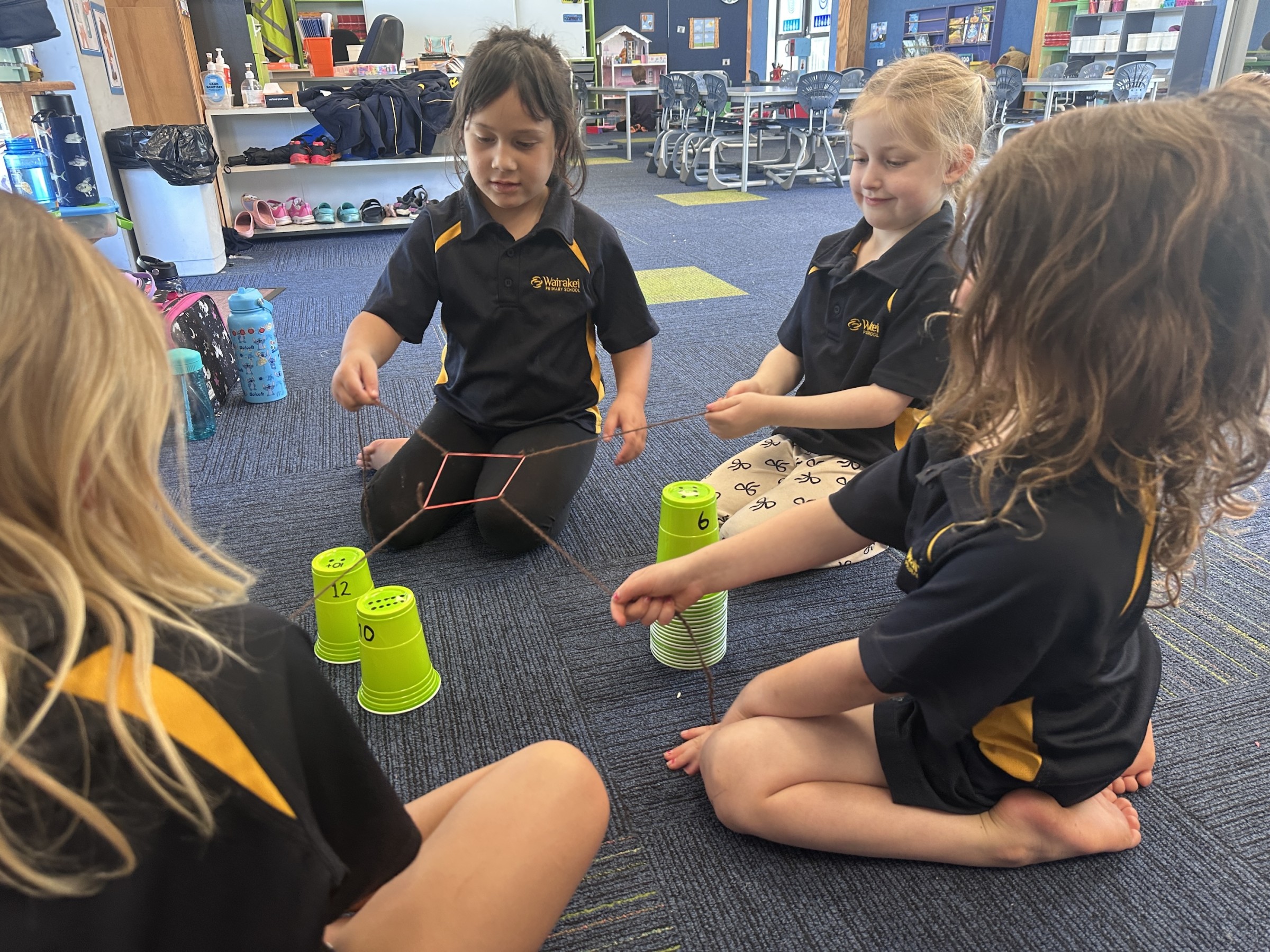 I told my group how to pull the string back more so we could get it on the cup. We put it over the cup so carefully so it didn’t fall and we were the fastest at stacking in the end.