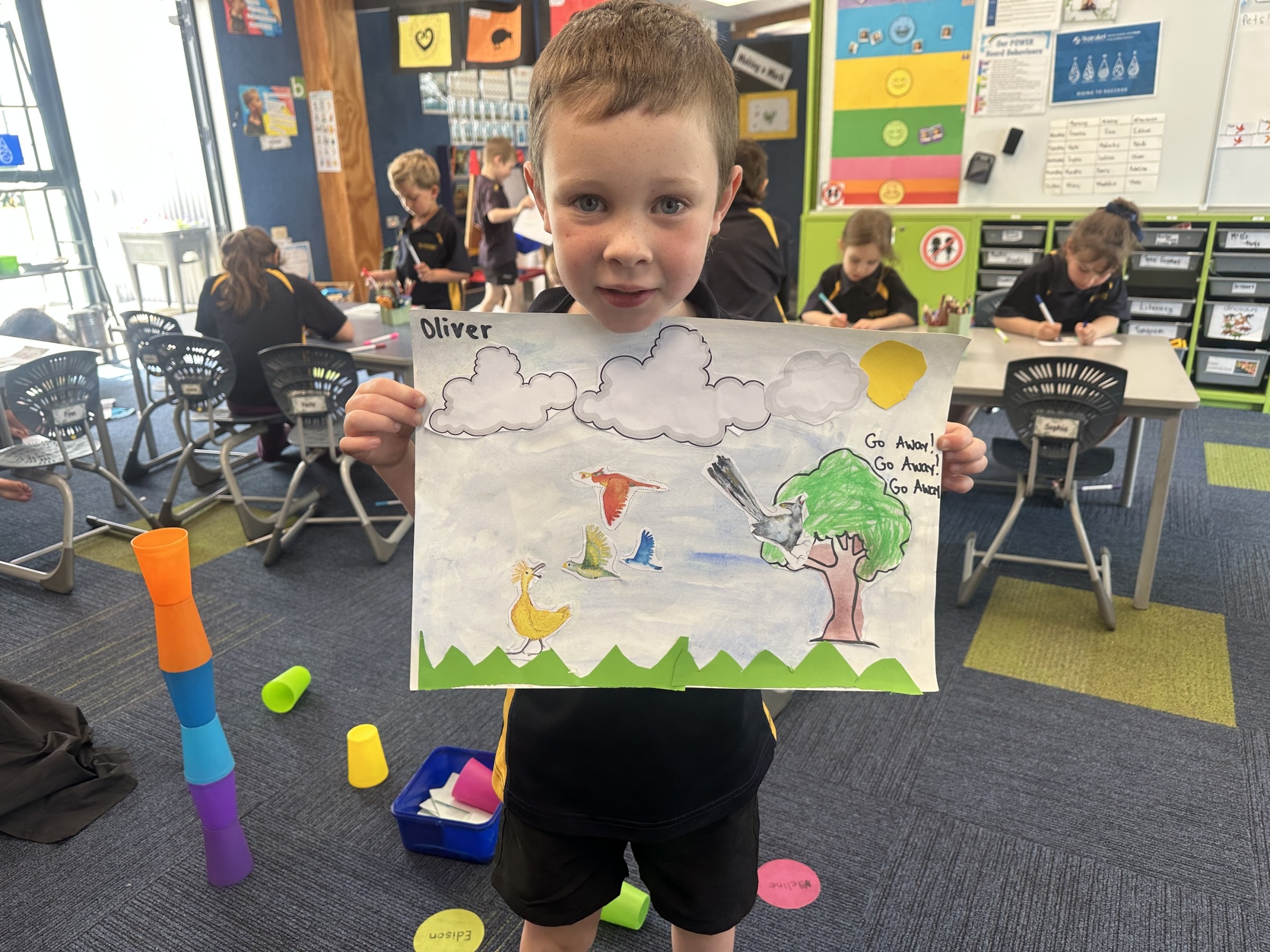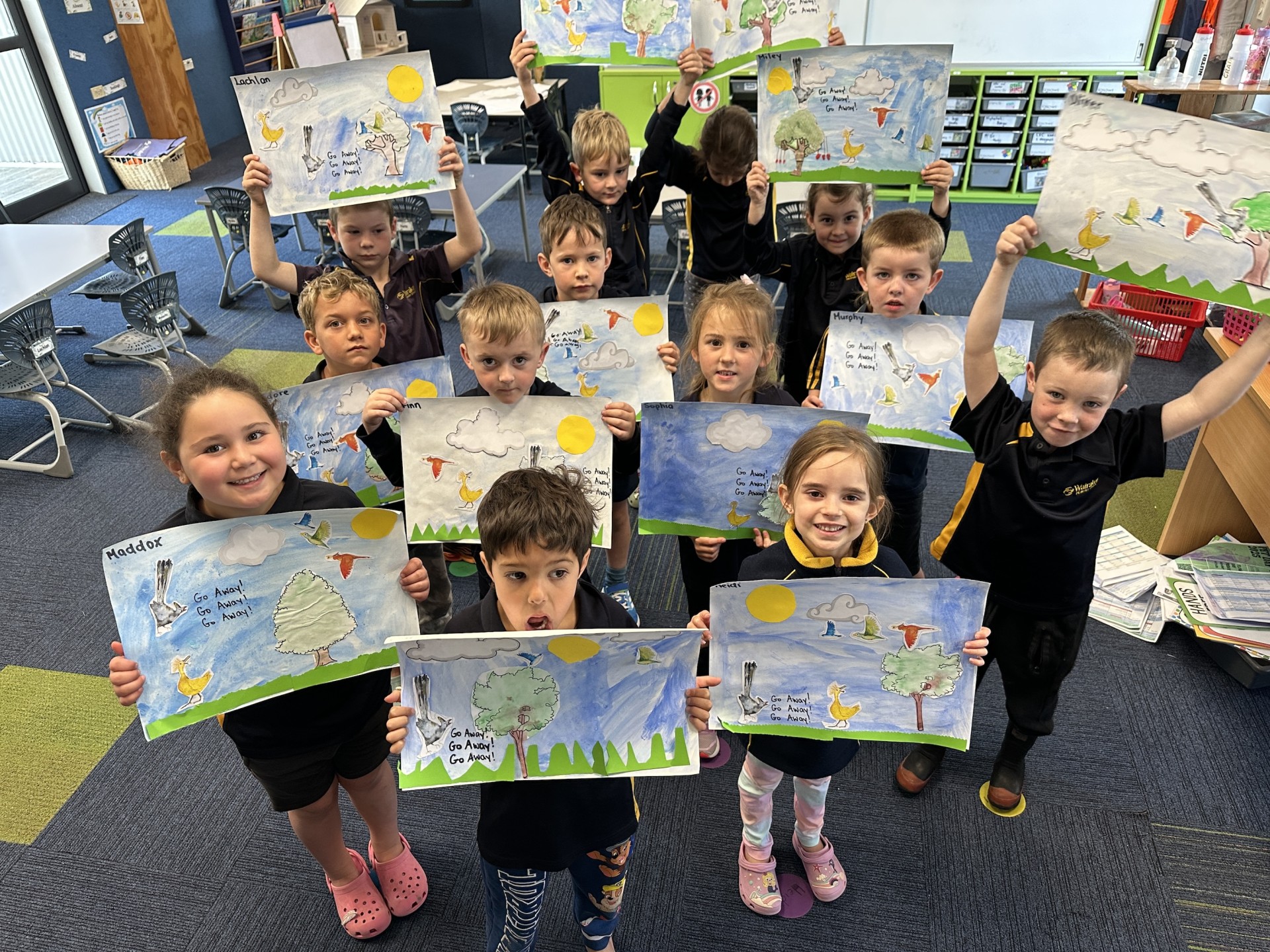 The focus was on a key language feature from the book: repetition. The phrase “Go away!” echoes throughout the story, helping students understand how repeated phrases can add rhythm and emphasis in storytelling. The children loved joining in with the familiar words and quickly started to recognise the pattern.