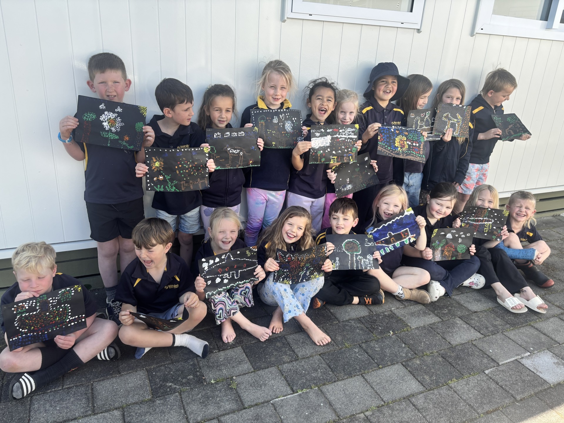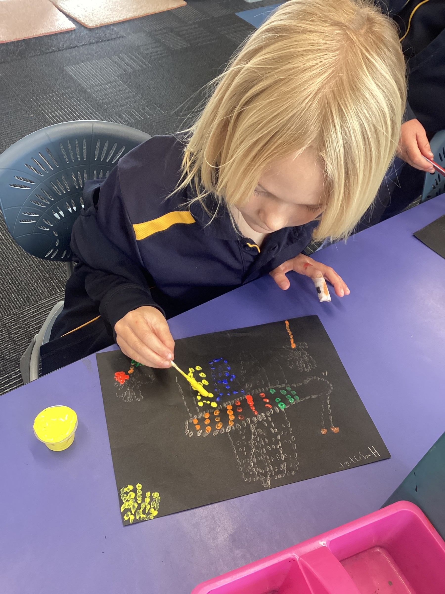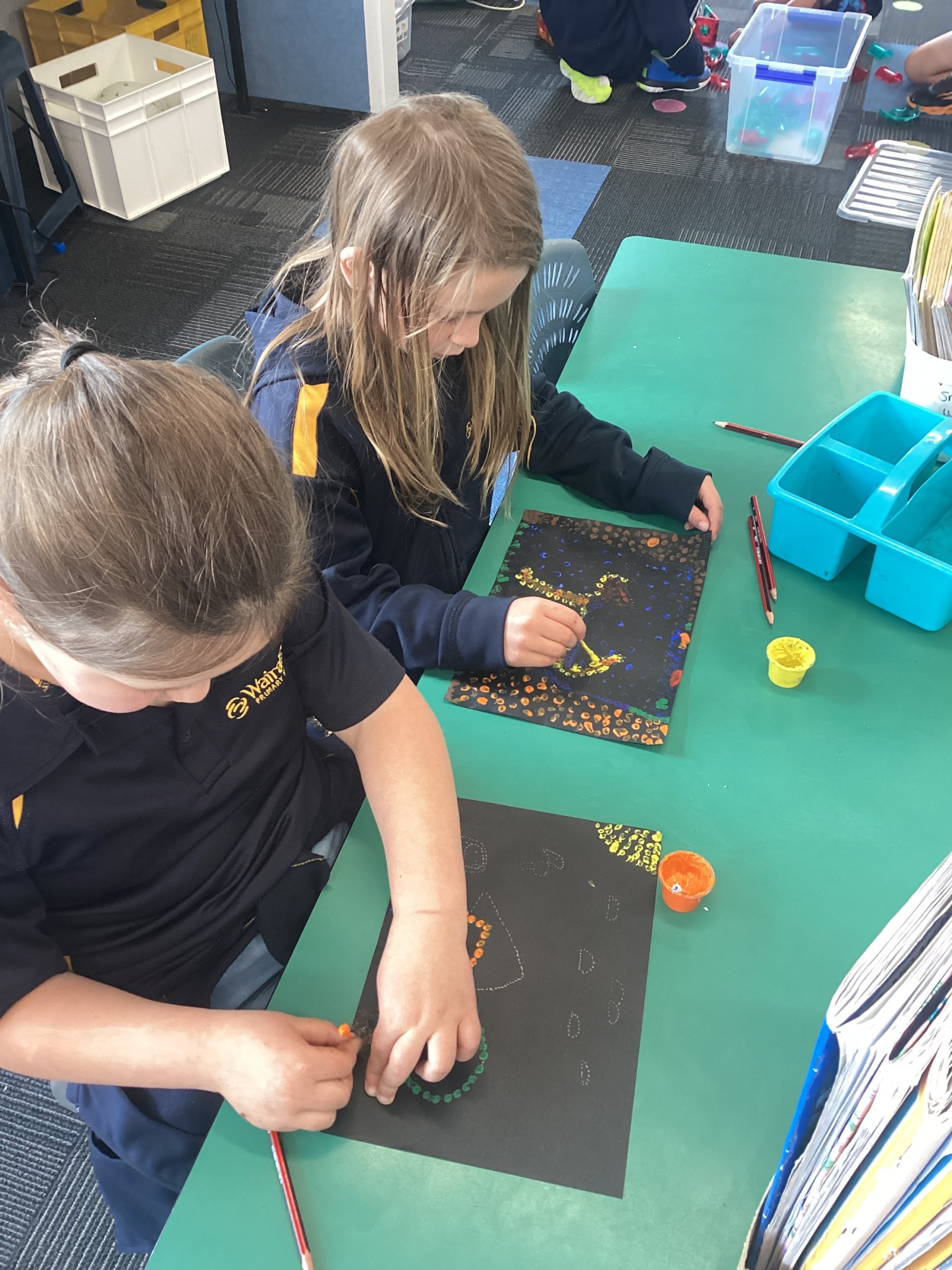 In Room 12, tamariki explored a special kind of art called dot painting, inspired by the Aboriginal people of Australia. This traditional style uses tiny dots to create beautiful illustrations and patterns that tell stories about the land, animals, and people.