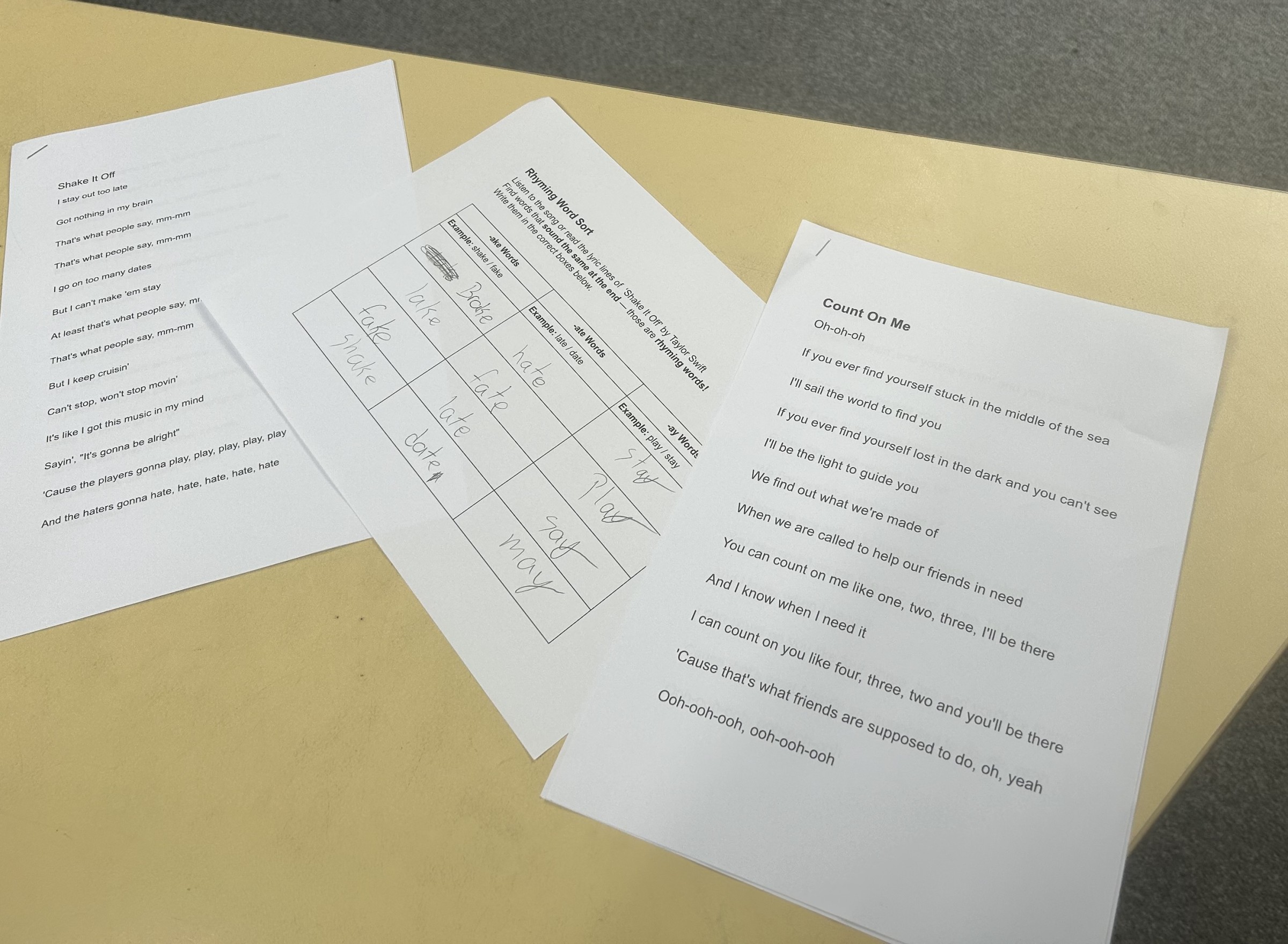 Two of the songs explored were “Count on Me” by Bruno Mars and “Shake It Off” by Taylor Swift. Count on Me uses simple, positive language and repetition, making it ideal for building fluency and confidence. Shake It Off is full of rhythm and rhyme, encouraging students to read with energy, expression, and a sense of timing.