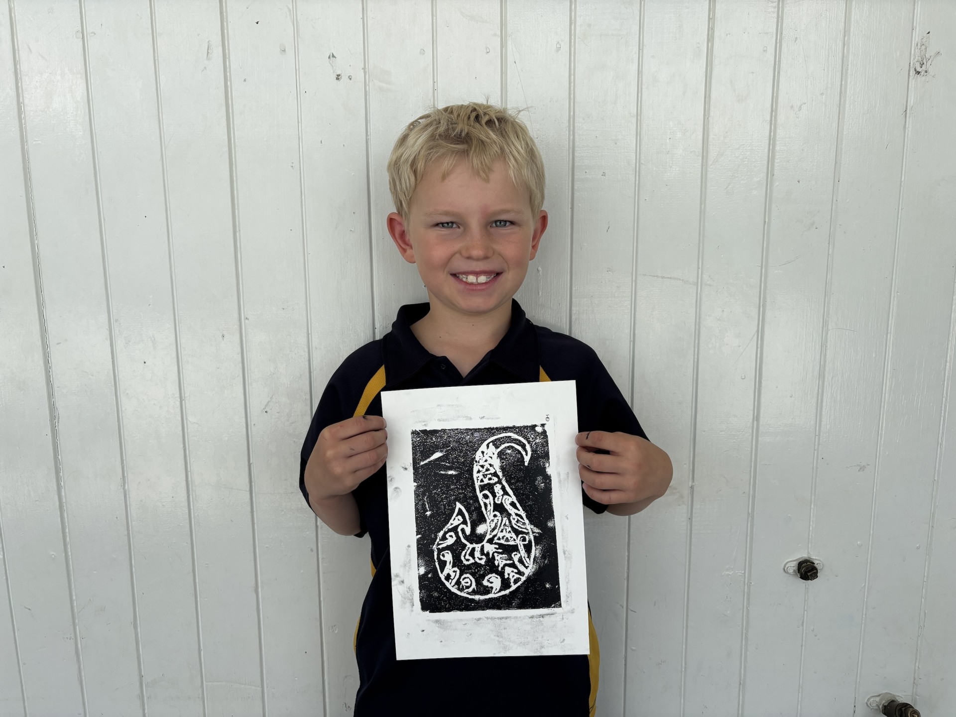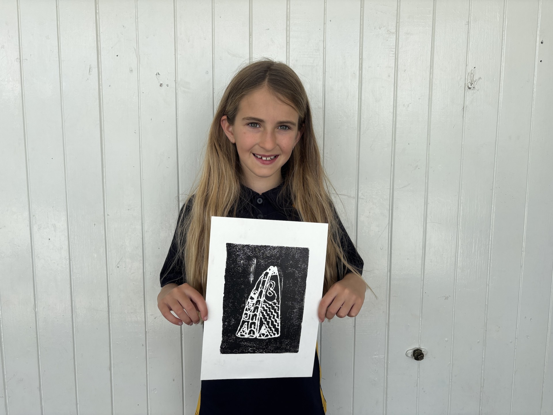 After gathering information, students researched traditional Māori symbols and chose three to four to incorporate into their designs. They carved foam blocks, applied ink, and printed their artwork. This process explored how symbols can be combined to tell a story that is uniquely theirs, even when using similar symbols as others.