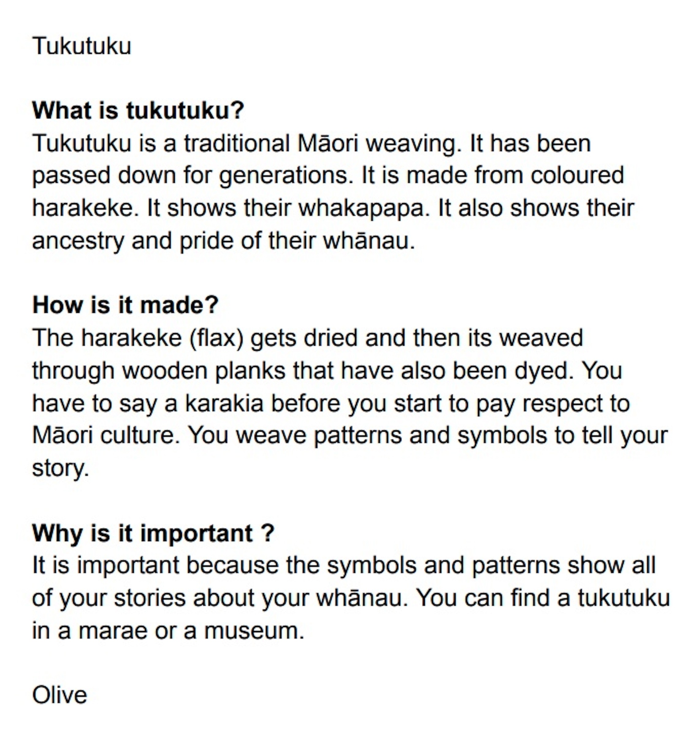“Some of the new words I learnt were ahi kaa, generations, culture, whakapapa and harakeke. I learnt it’s important to add the macrons to Māori words because it could mean a different word if you don’t.”