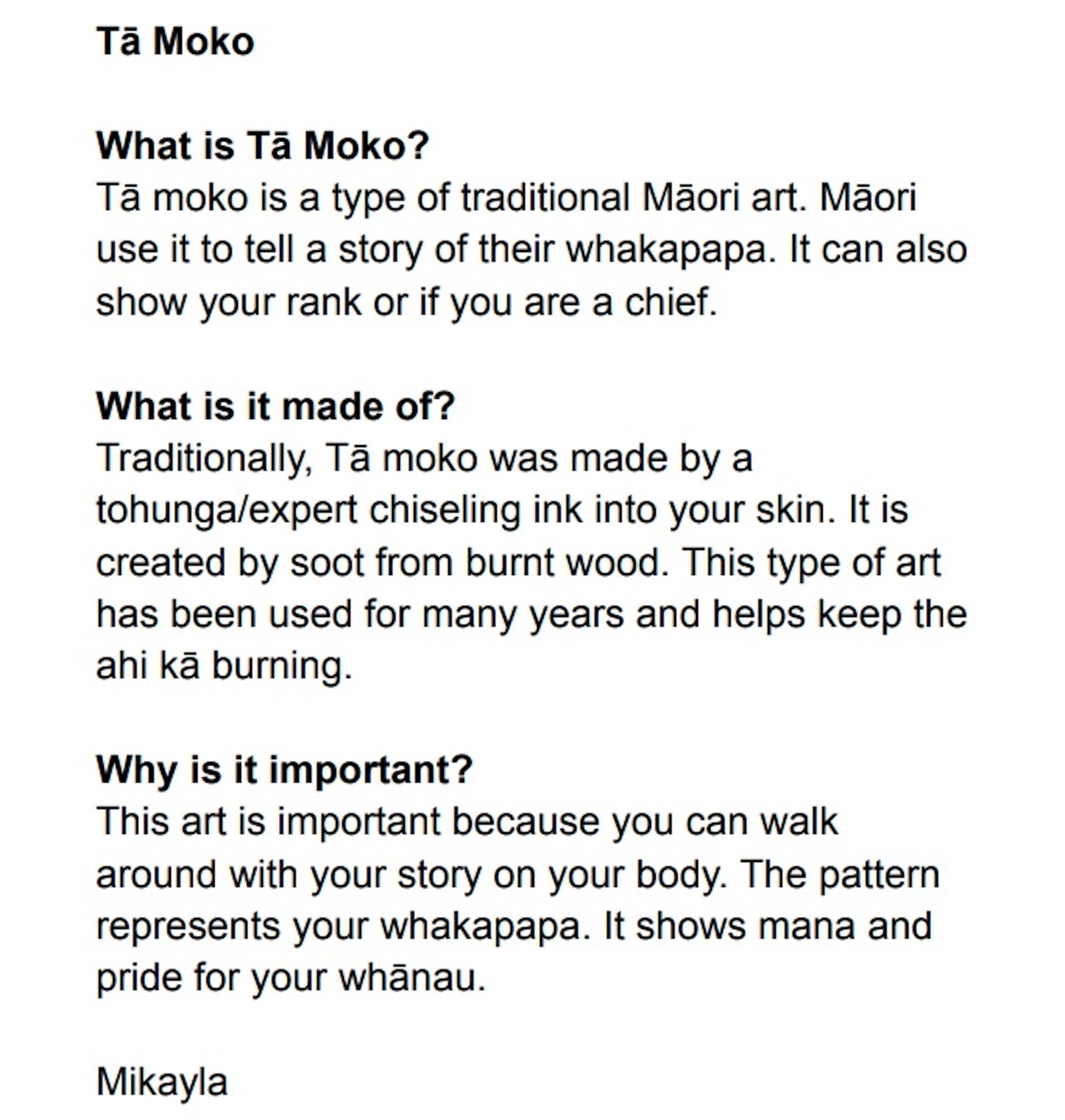 Over the past few weeks, students have been exploring different types of Māori art and writing explanations about different art forms. They did this by looking at images and researching the meanings behind patterns, symbols, and art types. Each lesson focused on a distinct art form, such as whakairo (carving), tukutuku (woven panels), tā moko (facial tattooing), and raranga (weaving). Students included its history, how it is made, and why it is important to individuals, iwi (tribes), and hapū (sub-tribes).
