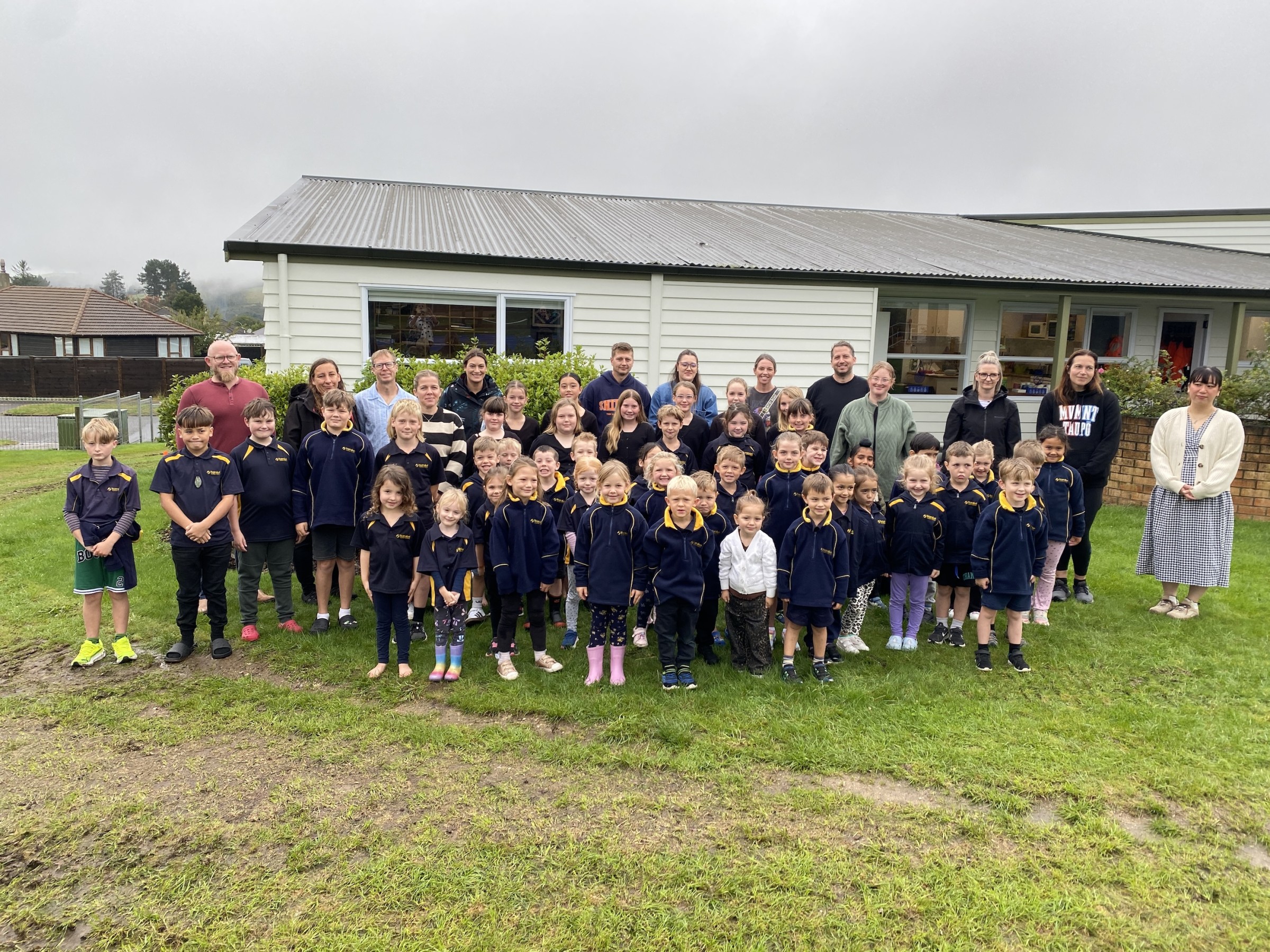 Welcome to the start of Term Two. An especially warm welcome to all new families and staff who have started at the school this week. The Year 6 leaders welcomed everyone to the school at pōwhiri in the morning, and we were able to take a photo of everyone outside.