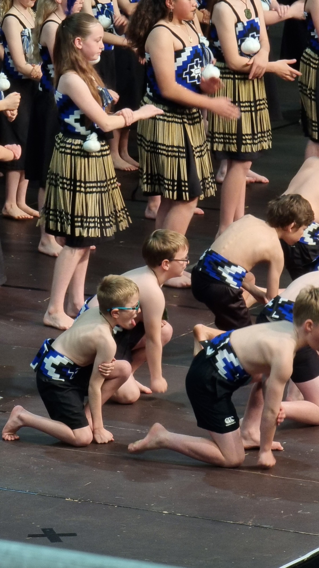 The junior group had been on stage 45 minutes before. Their songs represented the school using poi and haka moves. Many parents came to help dress and prepare the juniors to perform on the stage.